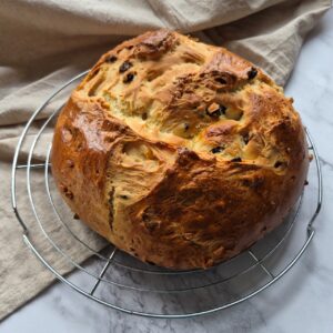 - Bag brødet i forvarmet ovn ved 180℃, i 30 – 35 minutter til det er gyldent på toppen og gennembagt.