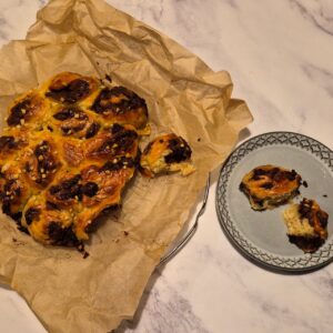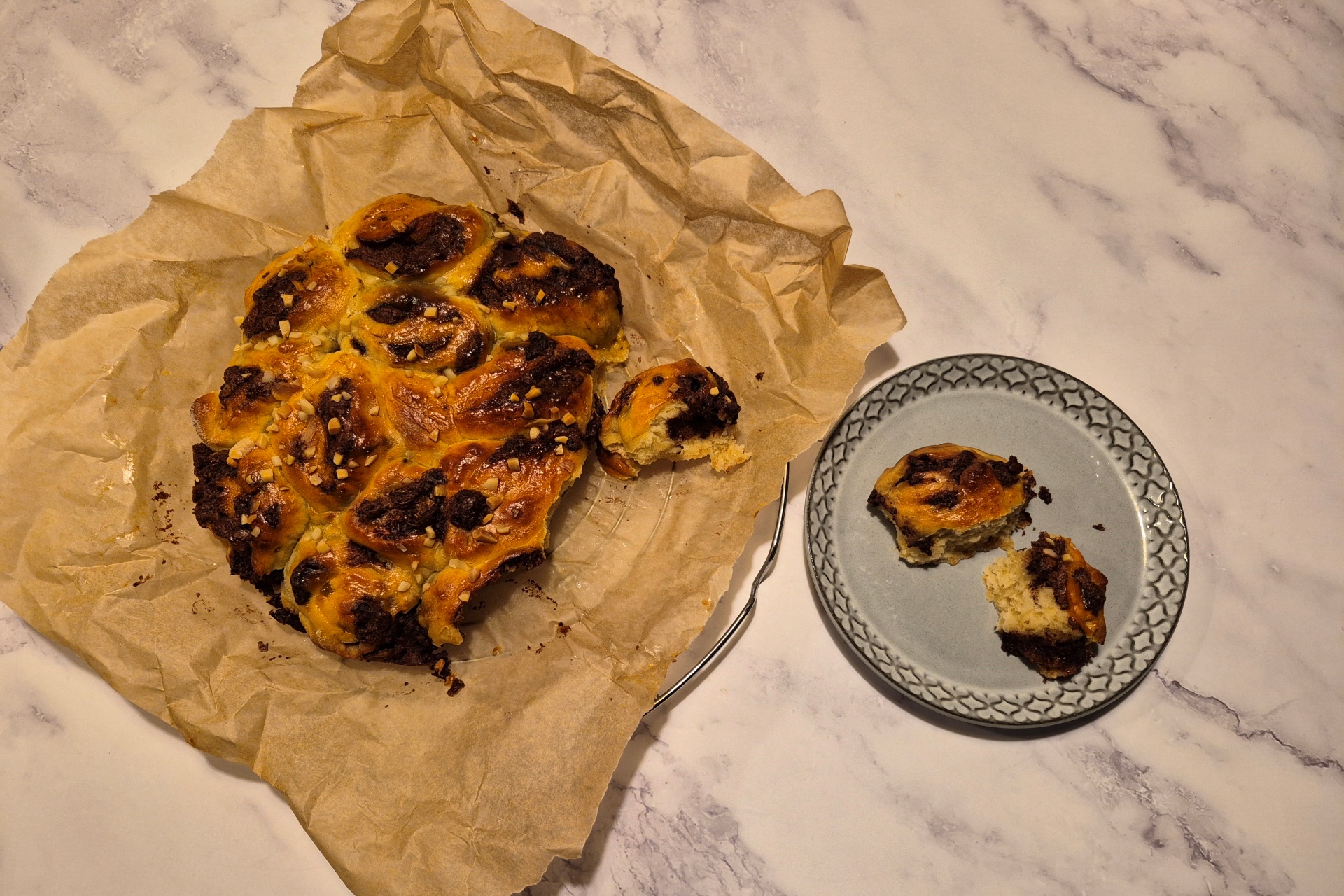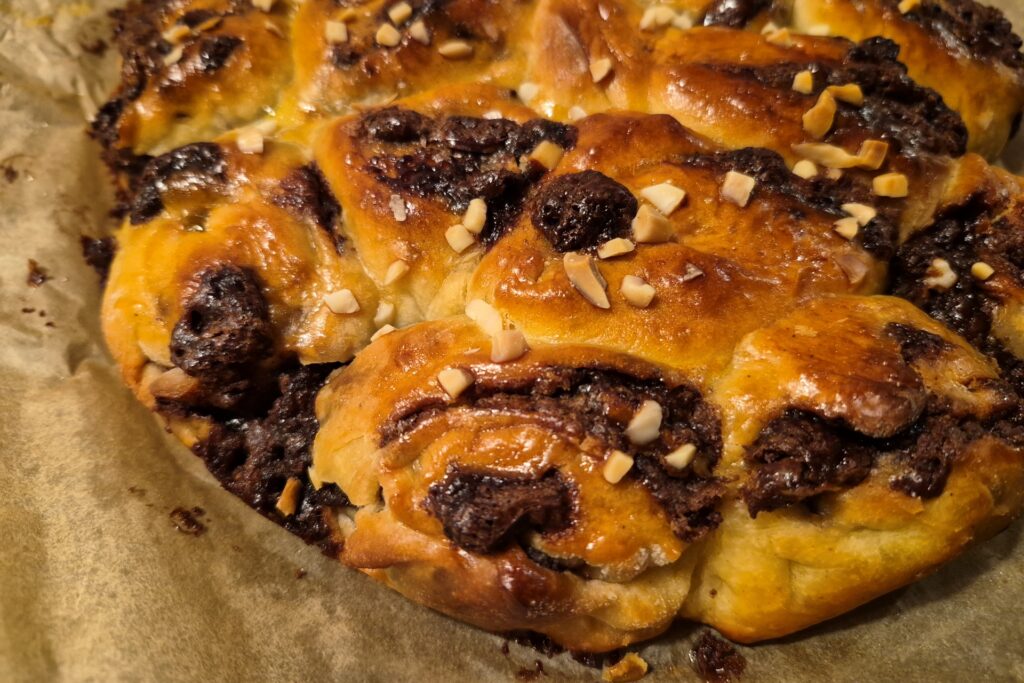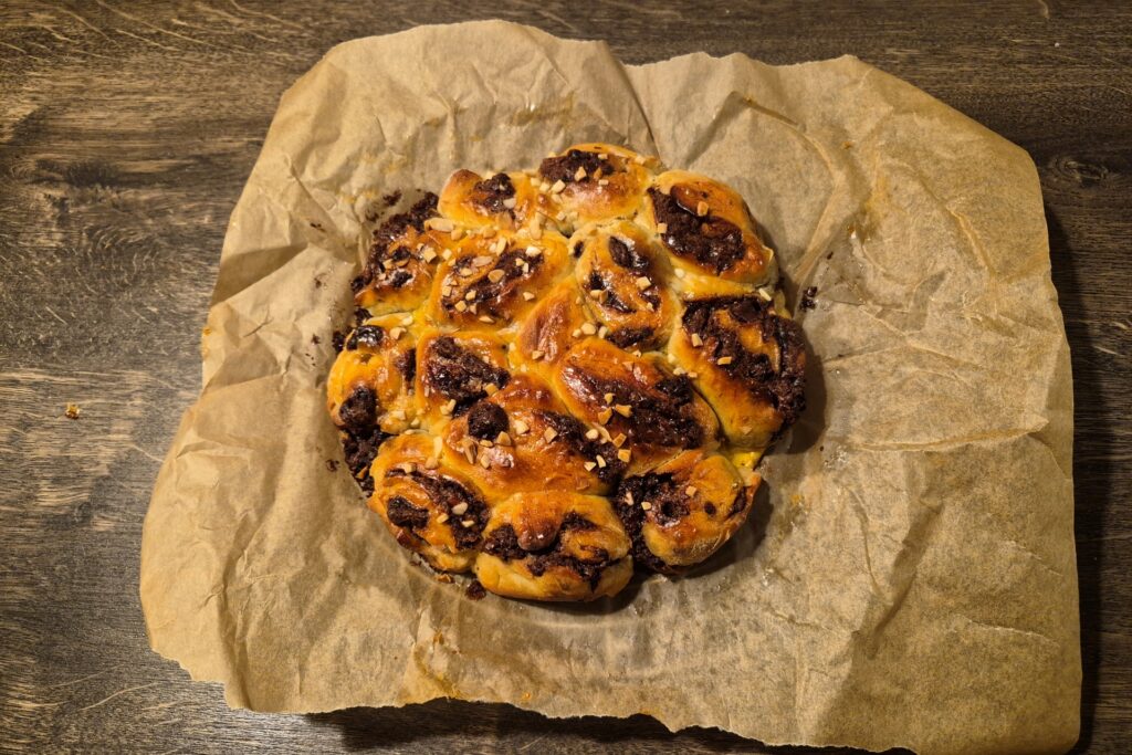 En variant af den klassiske kanelsnegl, her med fyld af Nutella og hakket mørk chokolade. Sneglene sættes sammen i formen så de er nemme at brække af.